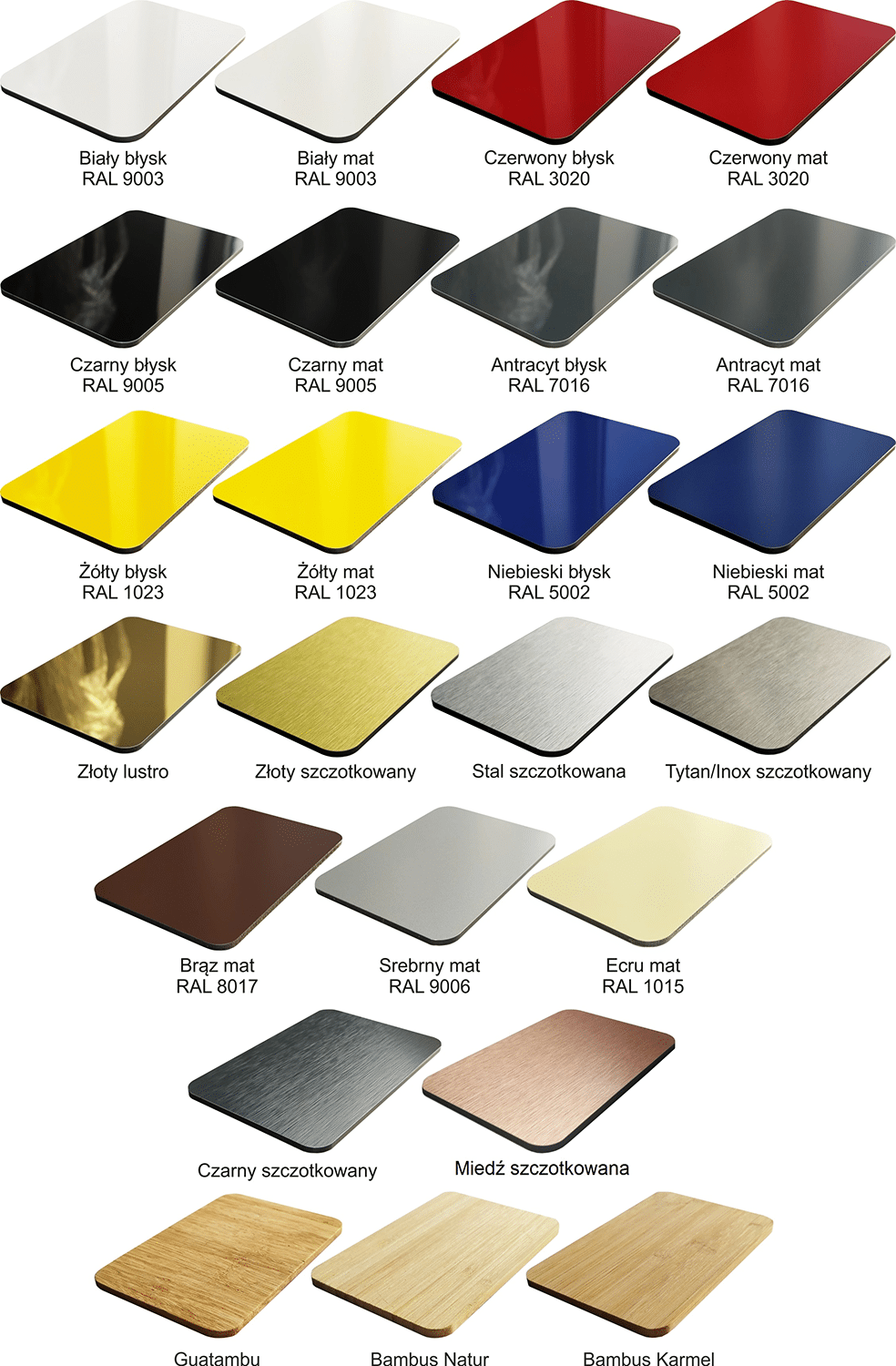 - rdzenia polietylenowego, najczęściej czarnego ale niektóre płyty 4mm mają rdzeń biały rdzeń