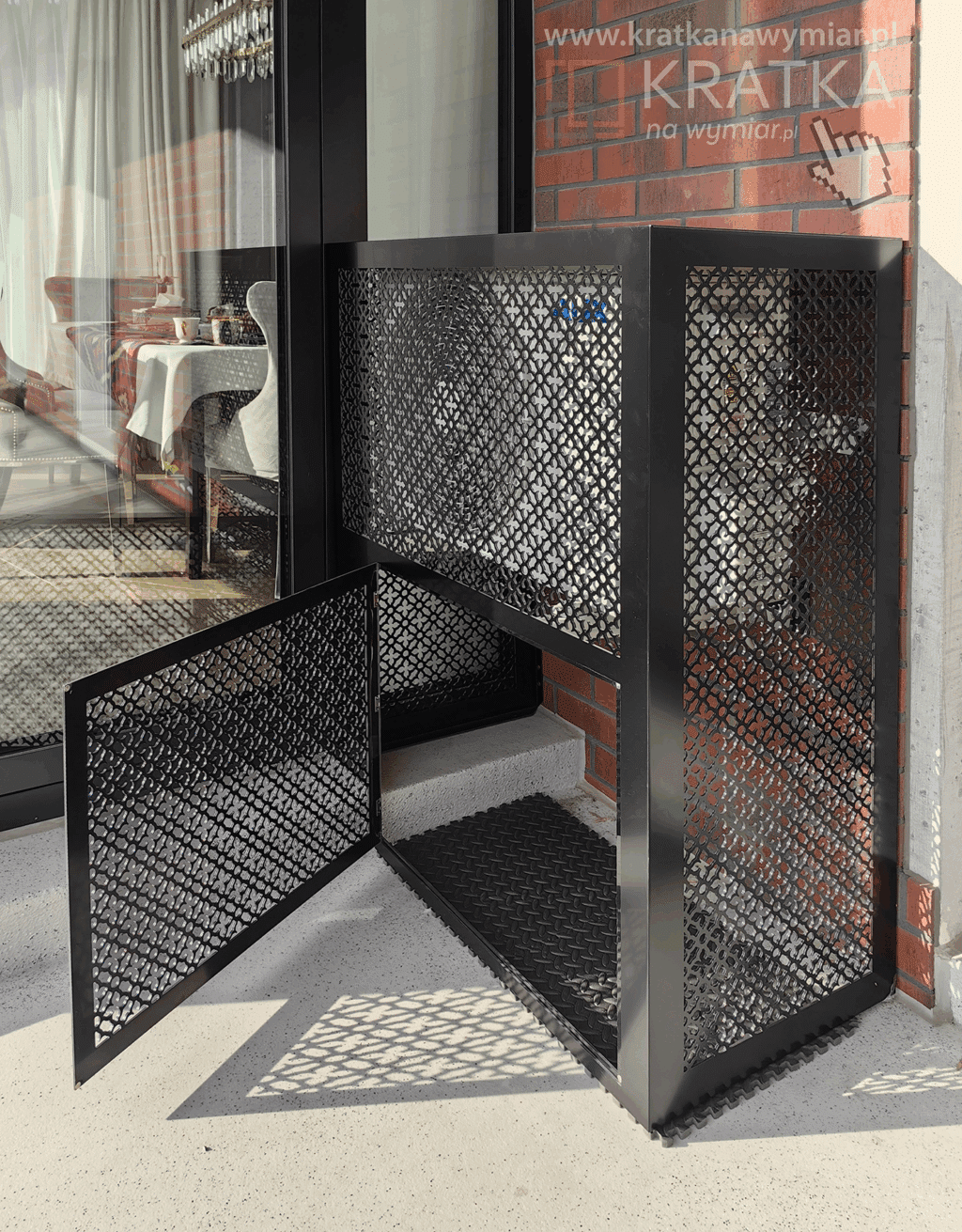 Paramterem kluczowym prawidłowego działania zewnętrznej jednostki klimatyzatora jest niezakłócony dopływ powietrza i zminimalizowany parametr dławienia. Jakie zastosowanie w praktyce ma powyższy parametr. Producenci klimatyzatorów i pomp ciepła zastrzegają, że każda jednostka musi mieć swobodny odopływ i odpływ powietrza aby jednostka mogła pracować bez zakłuceń. Zalecany jest minimalna odległość między ścianą a tyłem agregatu i brak przeszkody z przodu jednostki. W praktyce oznacza to, że zabudowa może być pełna jedynie górą i dołem a ścianki zabudowy z boków, gdzie musimy zapewnic dolot powietrza, i z przodu, gdzie należy zapwenić nieskrępowany wyrzut powietrza, muszą być wykonane z siatki i przynajmniej średnich oczkach lub skrajnie ażurowe aby zapewnić jak najniższy parametr dławienia przepływu. W praktyce oznacza to, że osłona w tych miejscach powinna zapewnić prześwit na na poziomie minimum 85%. Jest to zadanie niewykonalne w przypadku materiałów takich jak sklejka, mdf, drewno i tworzywa oraz niemożliwe do uzyskania w procesach wykrawania mechanicznego, plazmowego i laserowego w blachach stalowych i aluminiowych. Jedynym rozwiązaniem zapweniającym spełnienie powyższego parametru a nawet przekroczenie go do poziomu nawet 99% jest wykonanie osłony w naszej technologii z aluminiowej płyty kompozytowej.
