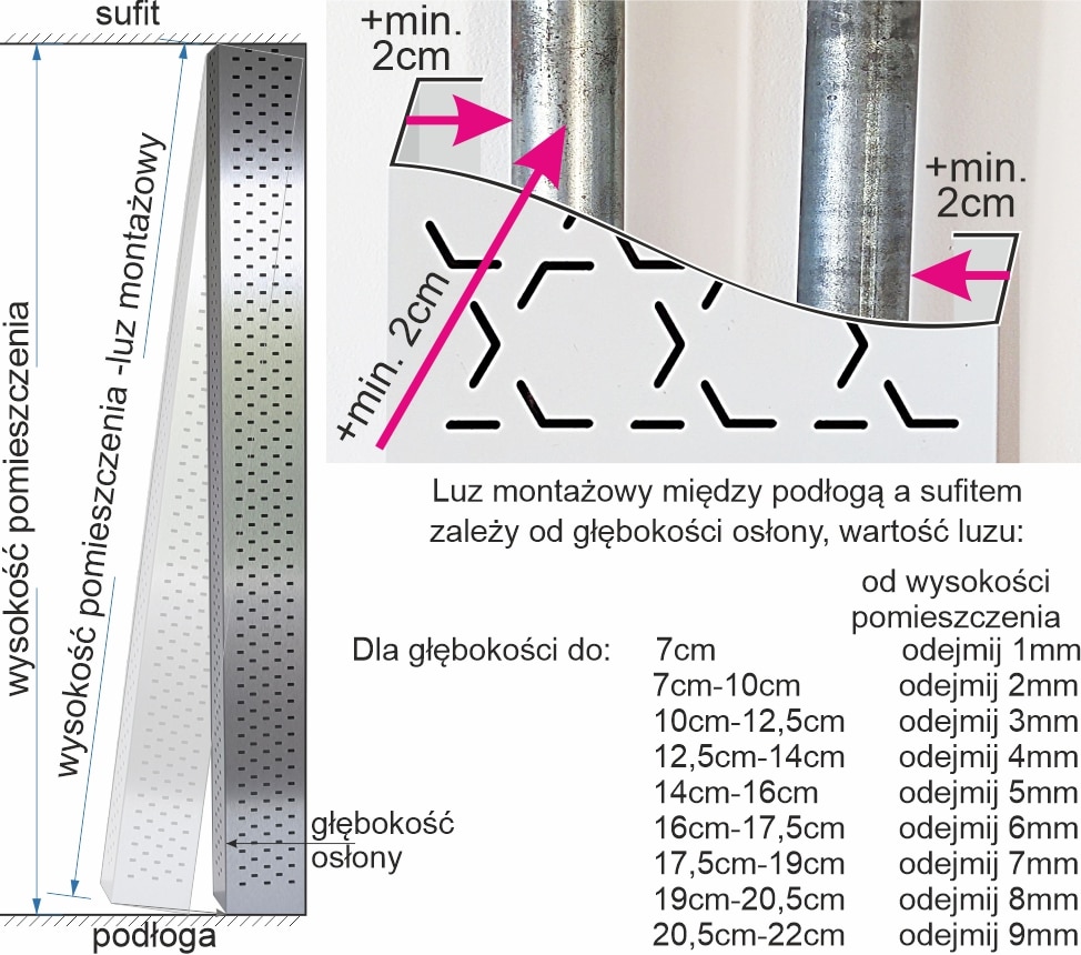 Dodaj minimum 2cm z lewej, z prawej i z przodu osłony aby przeprowadzić łatwy montaż oraz ukryć rury. Luz montażowy między podłogą a sufitem zależy od głębokości osłony,wartość luzu znajdziesz w tabeli powyżej
